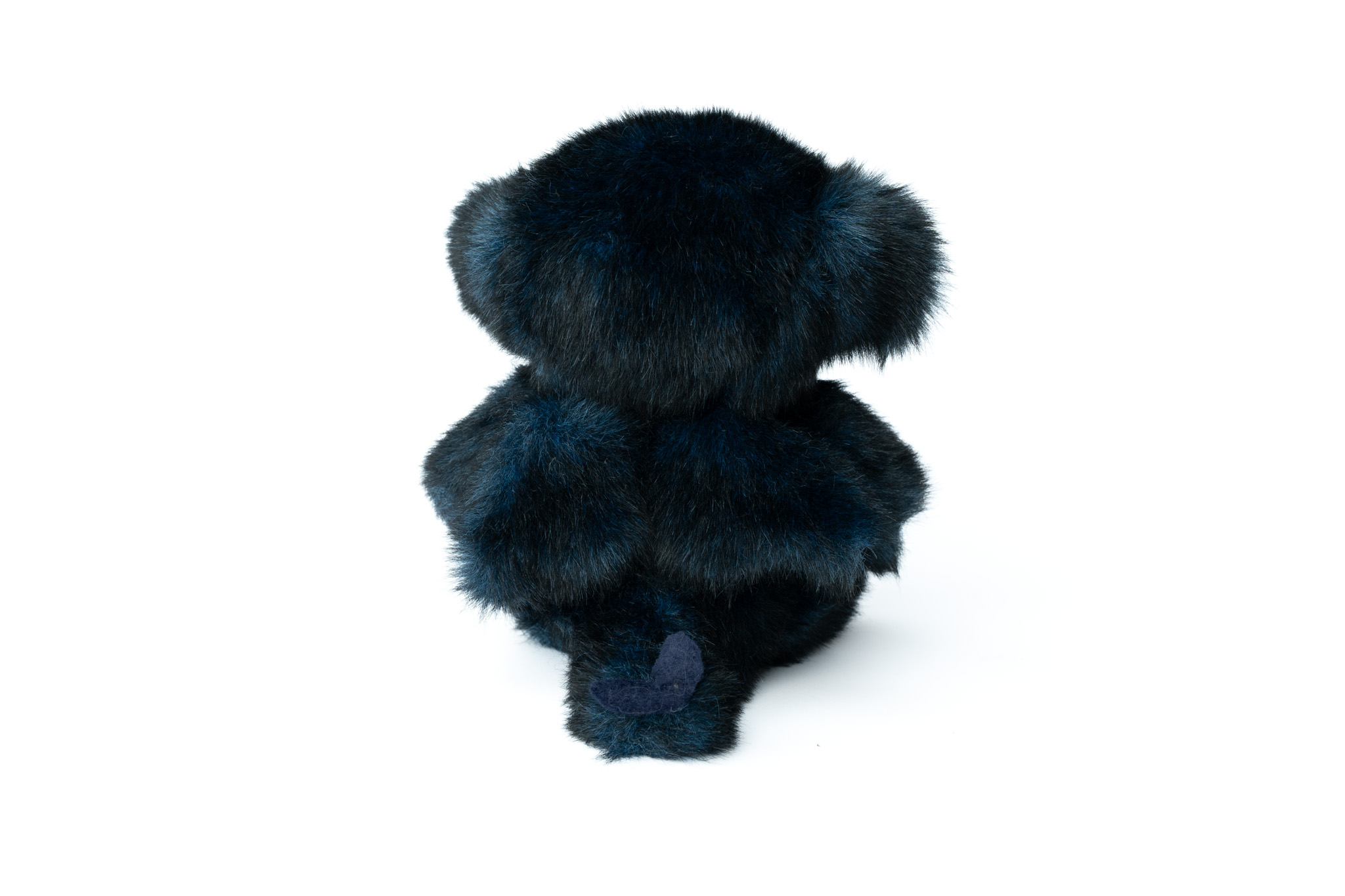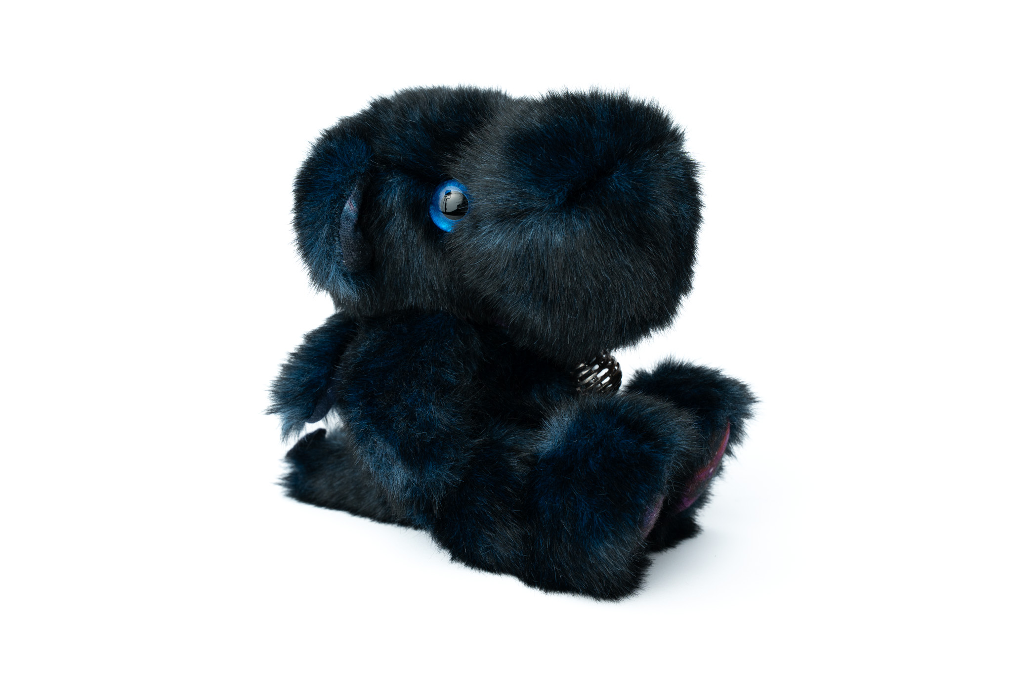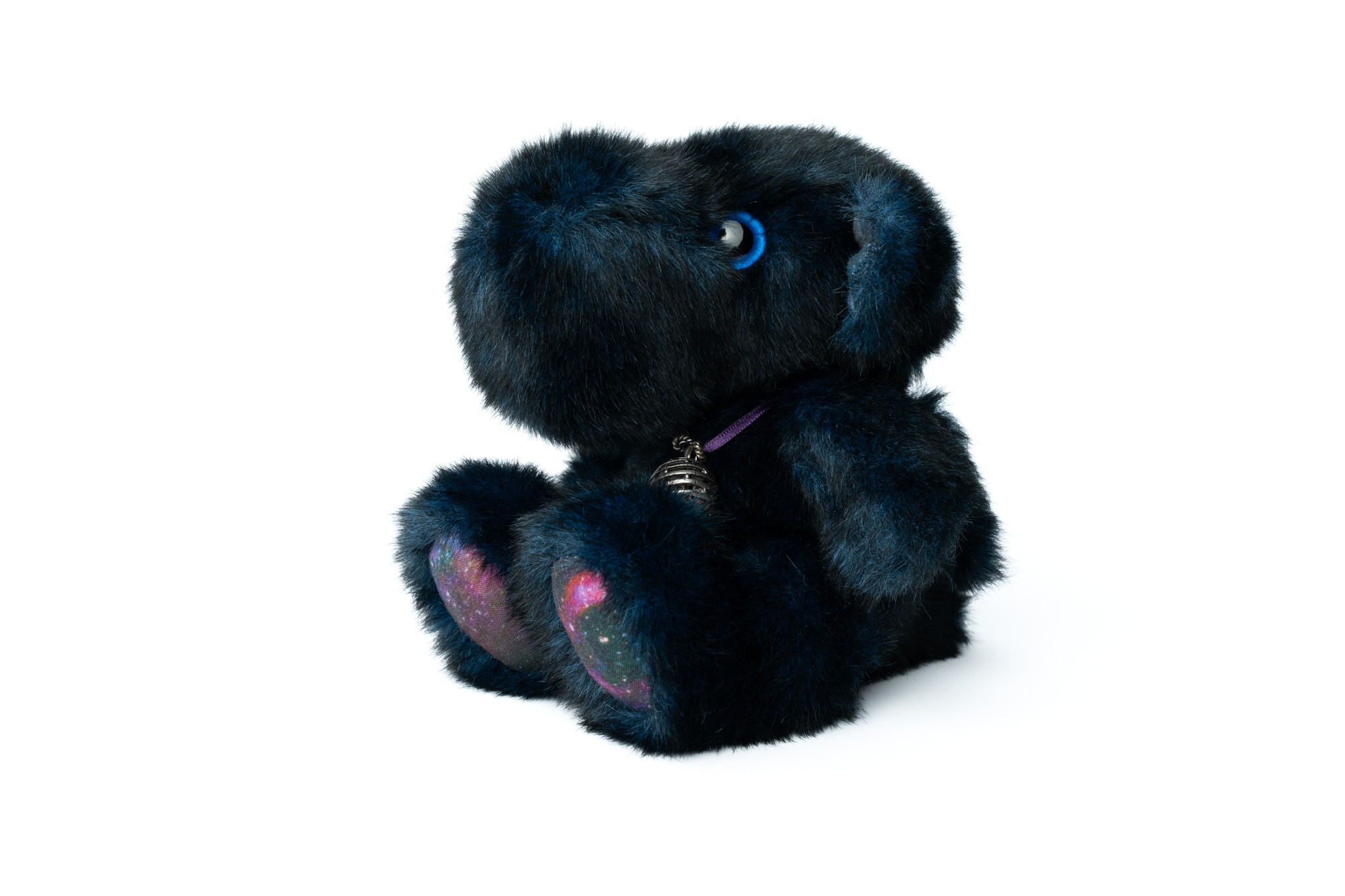 Made from a lovely dark blue and black fleck faux fur with space print polycotton inner ears and foot pads, Orion is firmly stuffed with a highloft polyester stuffing. They have blue sparkle glass eyes and are five way jointed with a cotter pin for the head and thread jointed arms and legs. Orion also wears a metal pendent around their neck that is remincesnt of a gaseous planet.