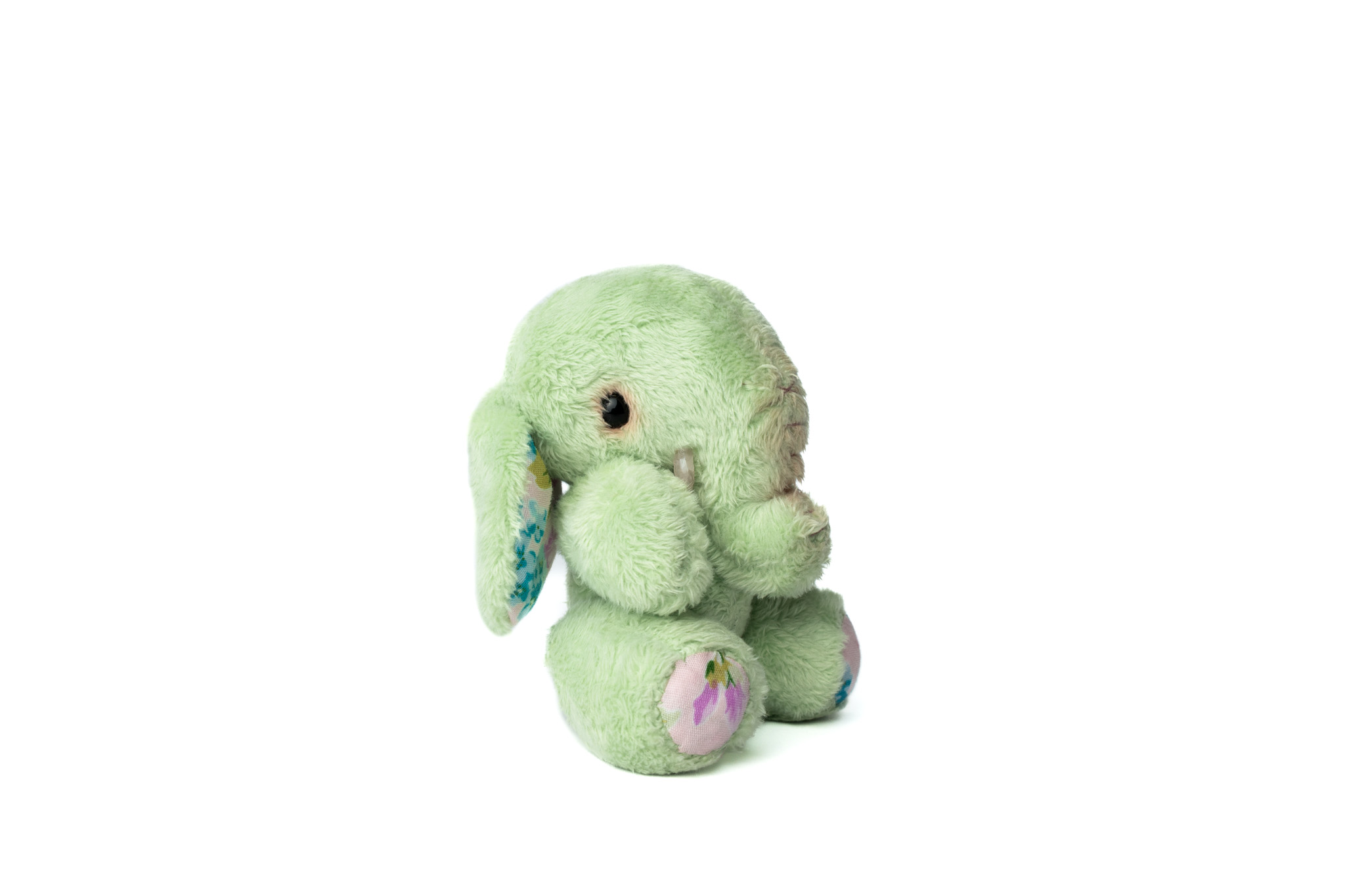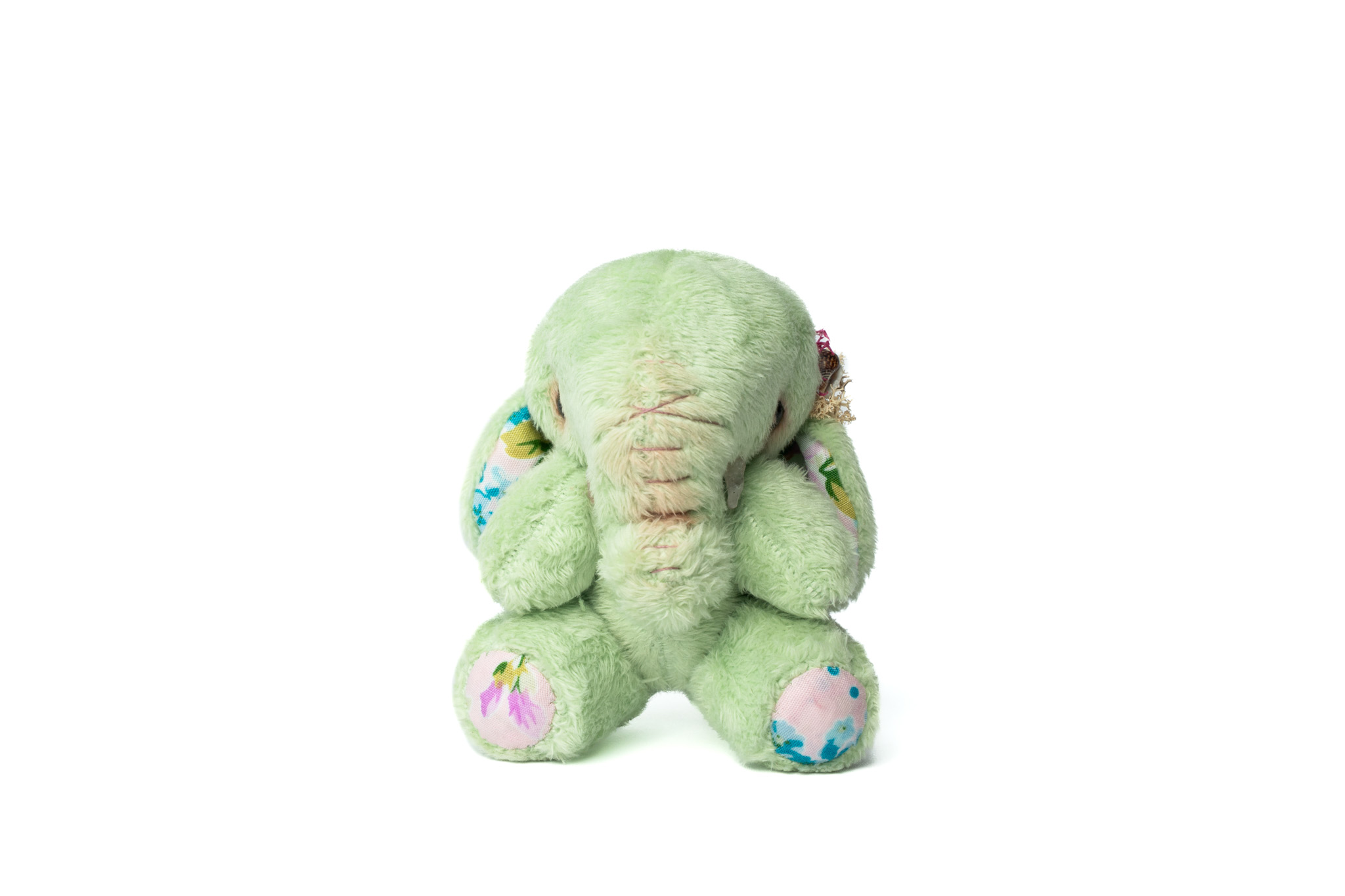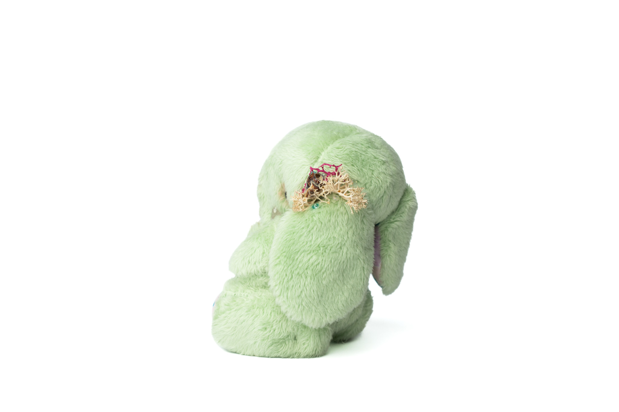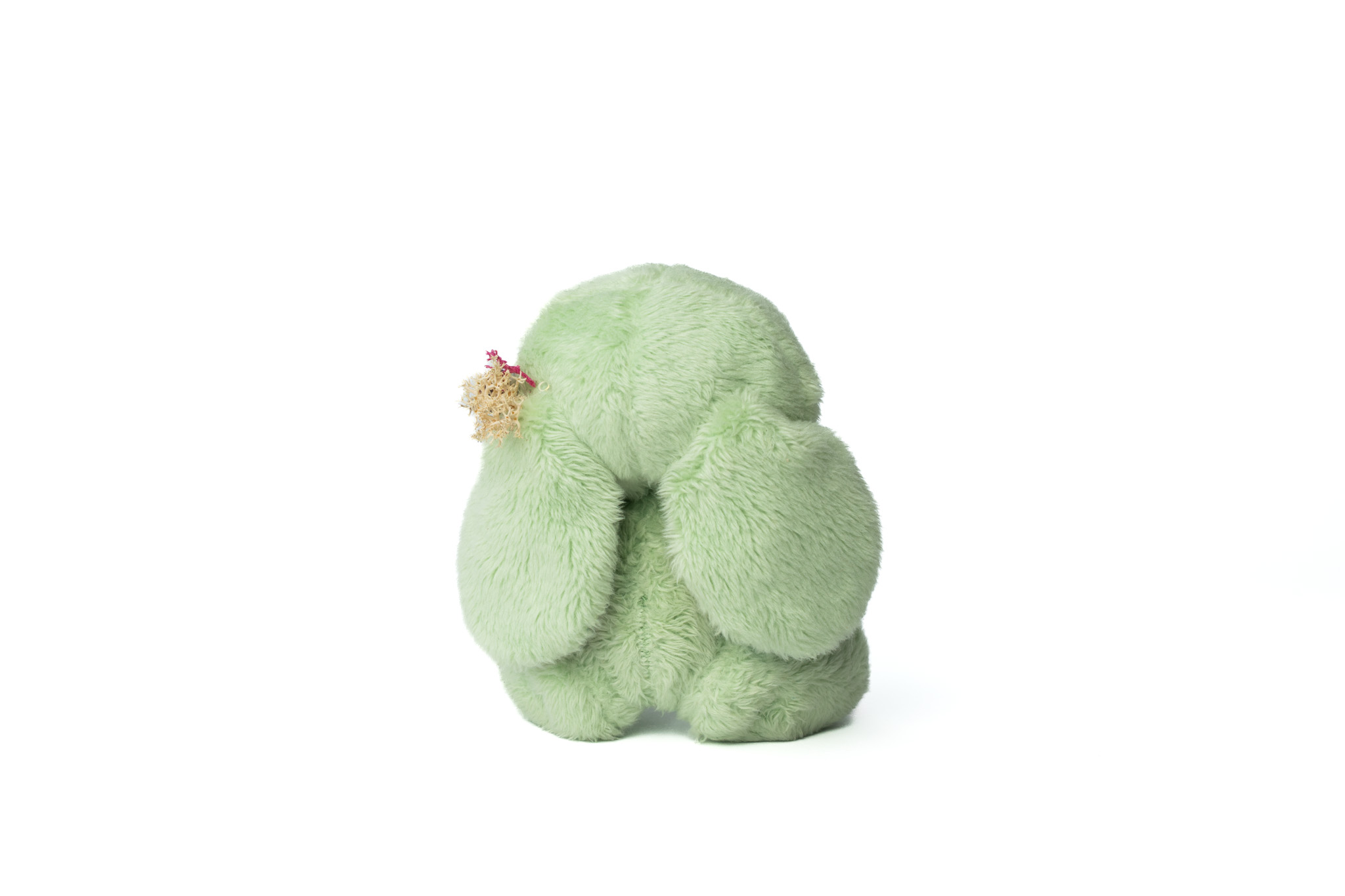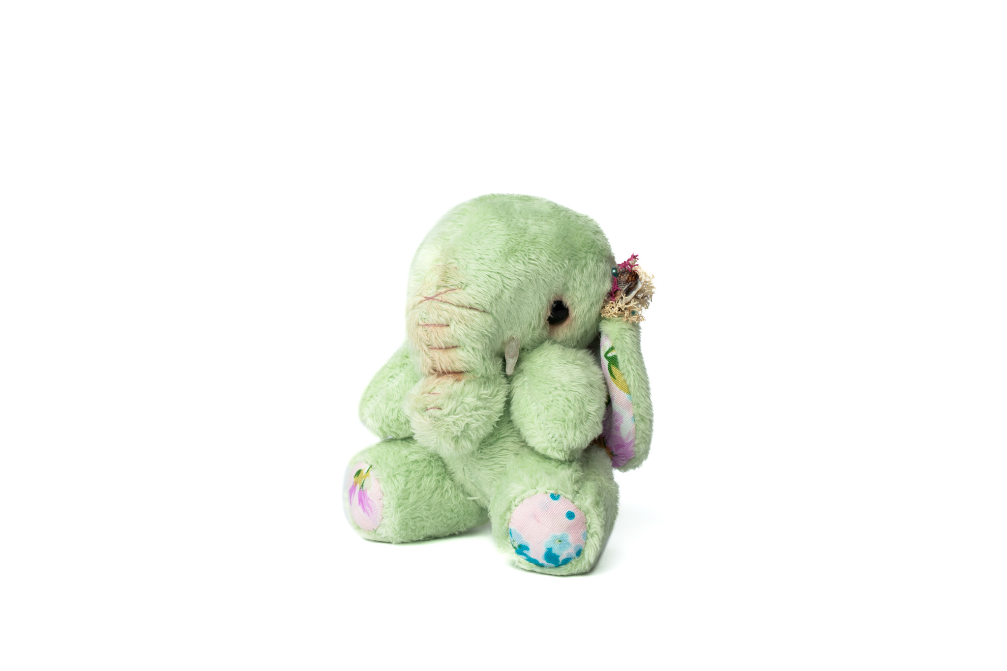 Made from a super soft short pile faux fur in a mint green colour and with pink floral polycotton inner ears and foot pads Coral is firmly stuffed with a combination of clean steel disk weights, highloft polyester and heavy fiberfill stuffings. She has glossy black glass eyes and is five way jointed with a cotter pin for her head and thread jointed arms and legs. Coral has small pink gemstone tucks and a few of her beach finds tucked behind her ear.