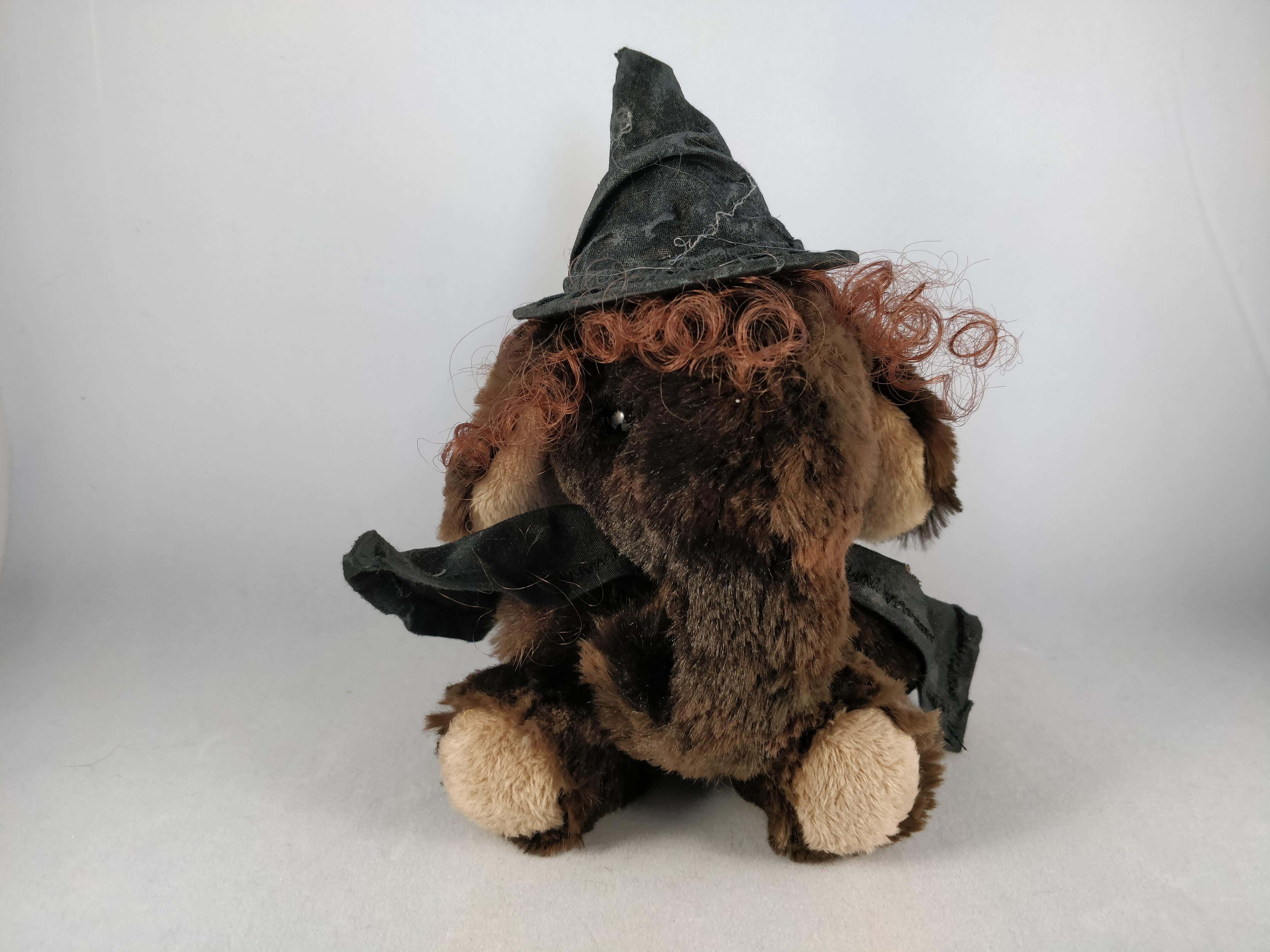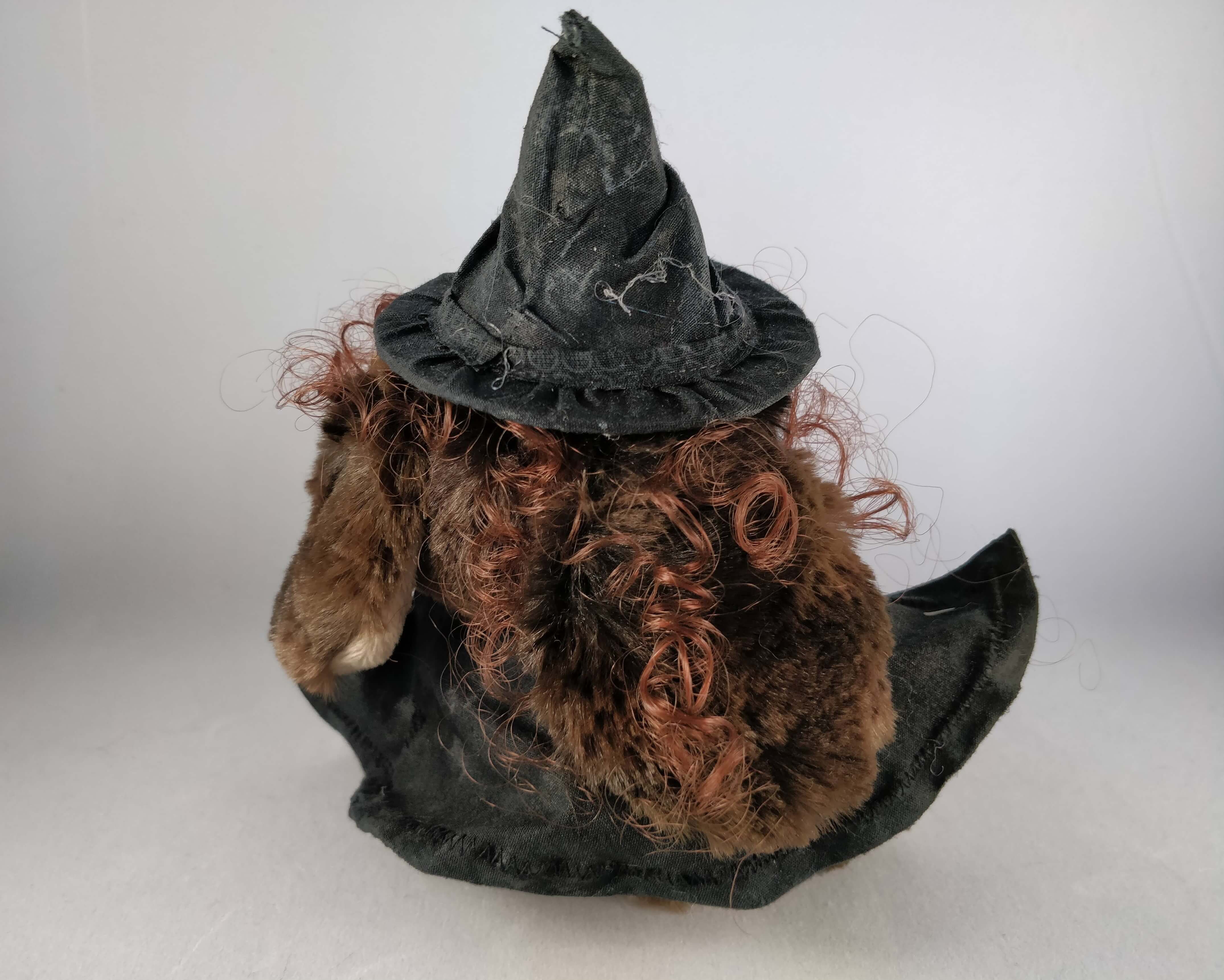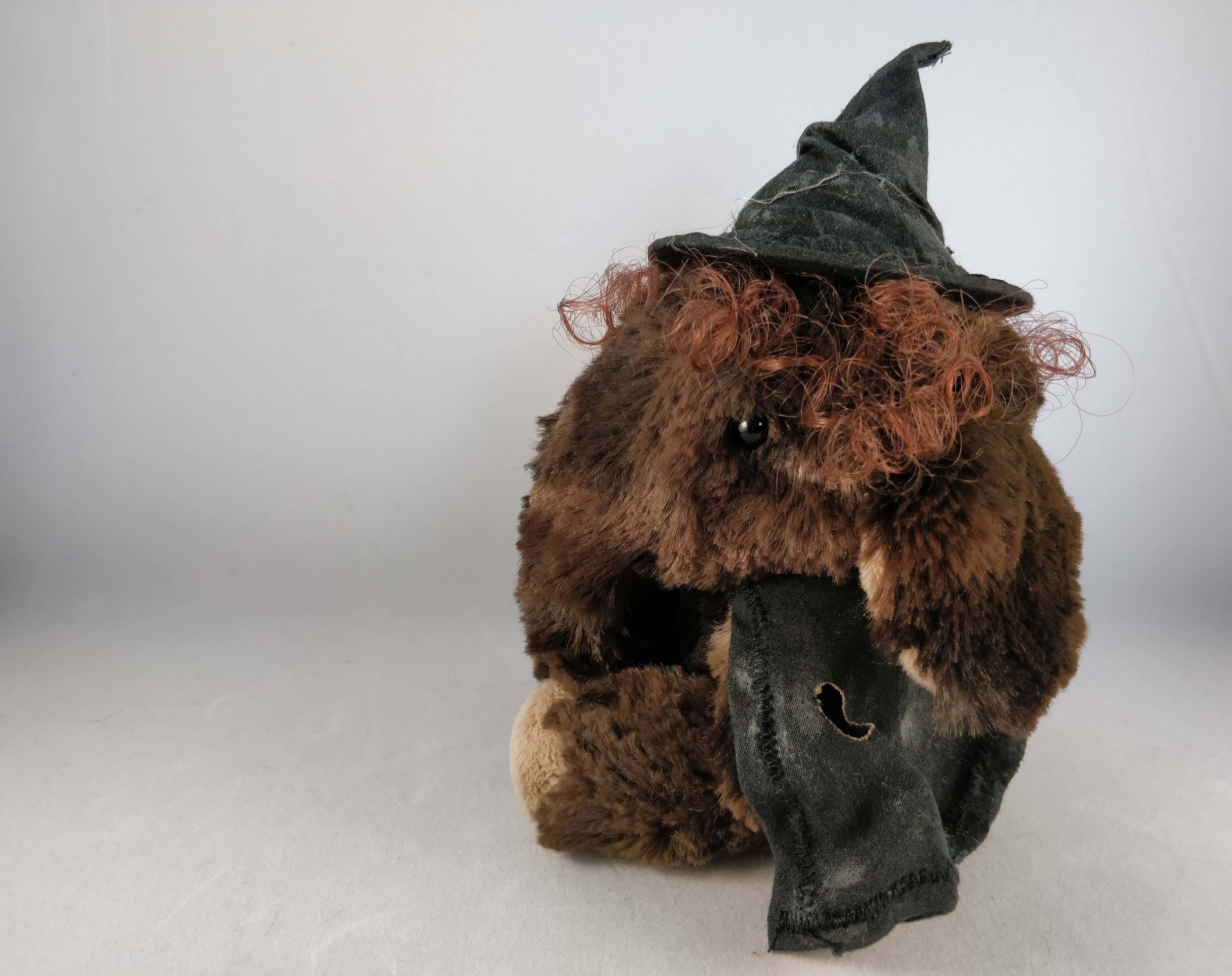 Elsebeth, a somewhat clumsy witch with awfully bad luck when it comes to potions is a one of a kind artist bear who’s full height is 20cm (8″) tall to the tip of her hat, however she much prefers sitting where she is then approximately 16.5cm (6 1/2″) tall.