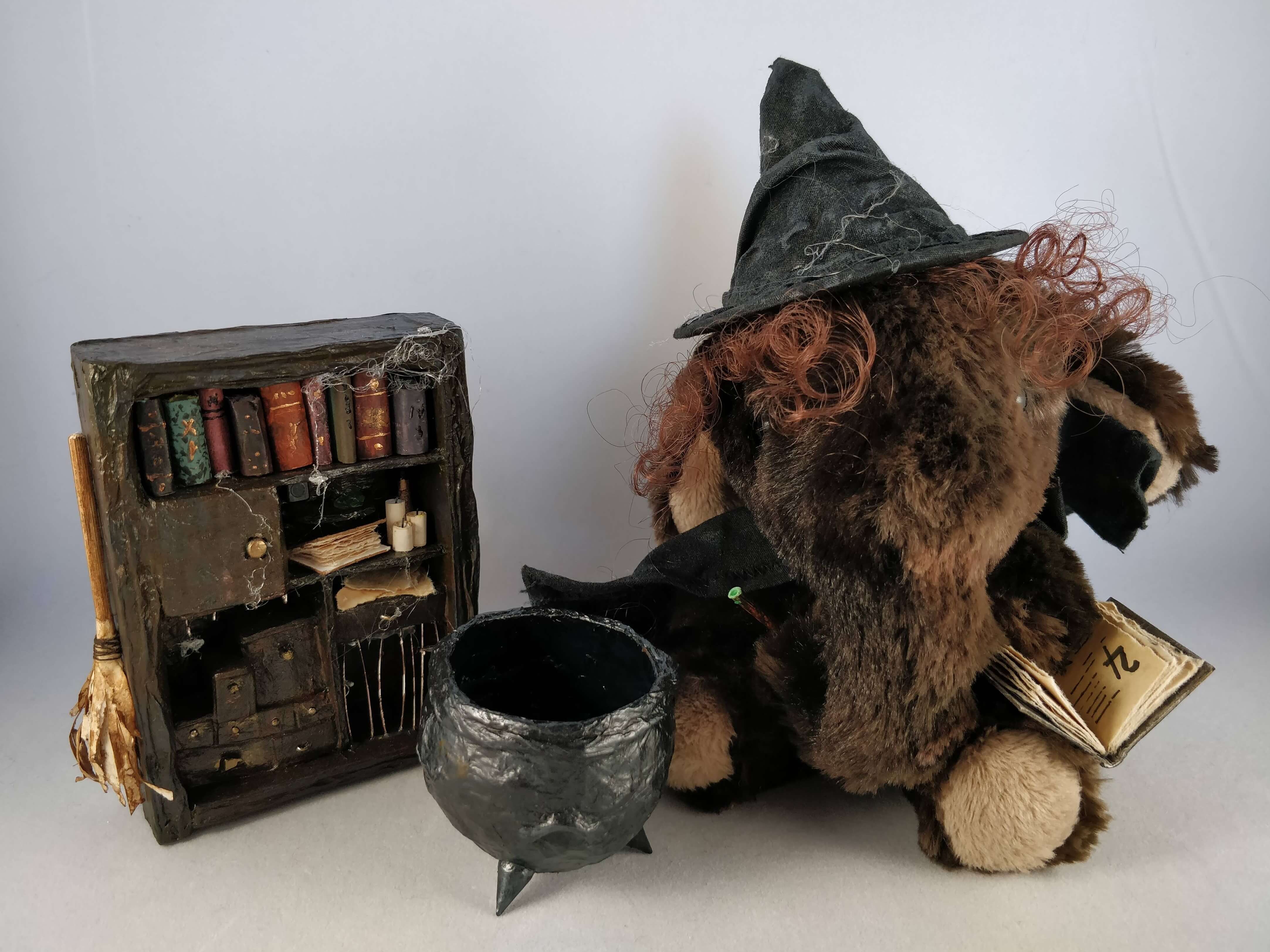 In addition to that wonderful hat Elsebeth wears a cloak which has been carefully aged to show wear from the many magical accidents she has caused over the years. She comes with her handmade shelves, cauldron, magic wand and spell book, ready to create a little bit of mischief wherever she goes.