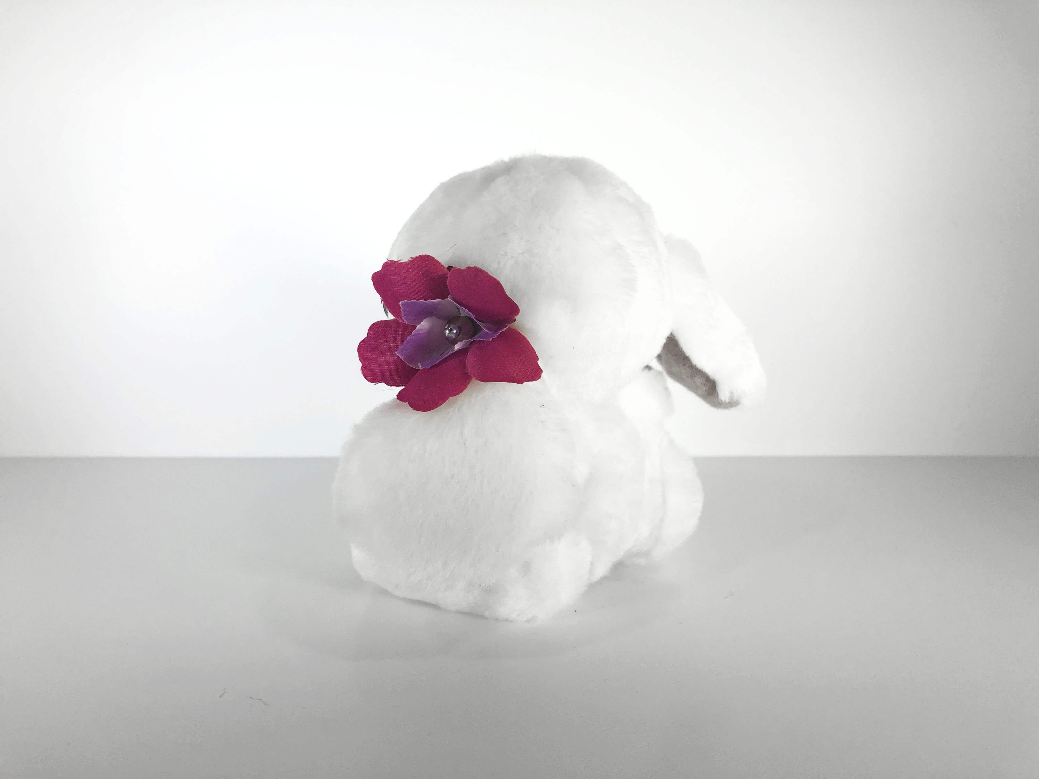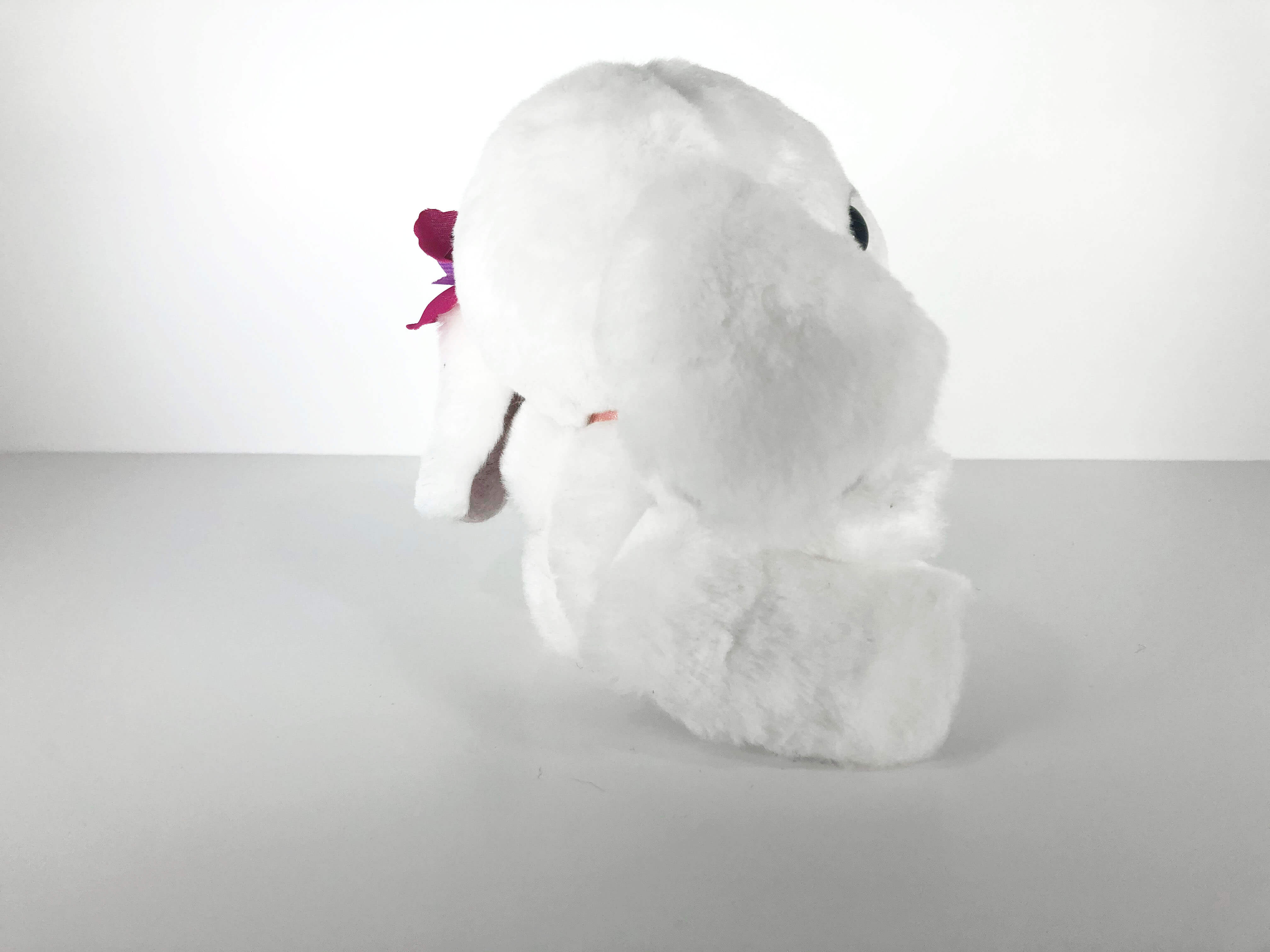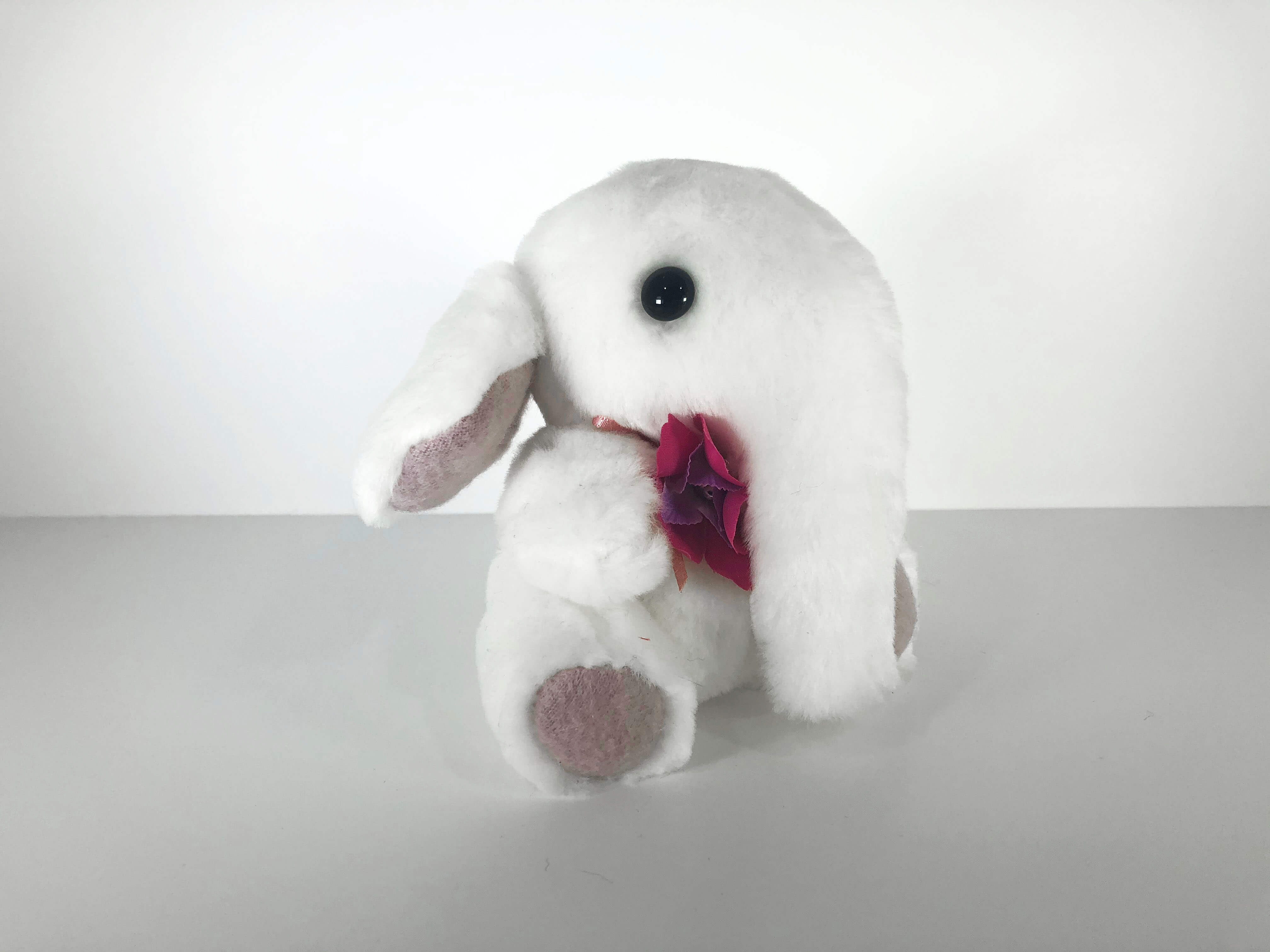 Leilani is made from a lovely dense ivory coloured faux fur with pale pink fleece inner ears and foot pads. She is stuffed with a natural wool stuffing and steel shot weights giving a nice weighty feel, she has glossy glass eyes and is five way jointed with a cotter pin for the head and thread jointed arms and legs.