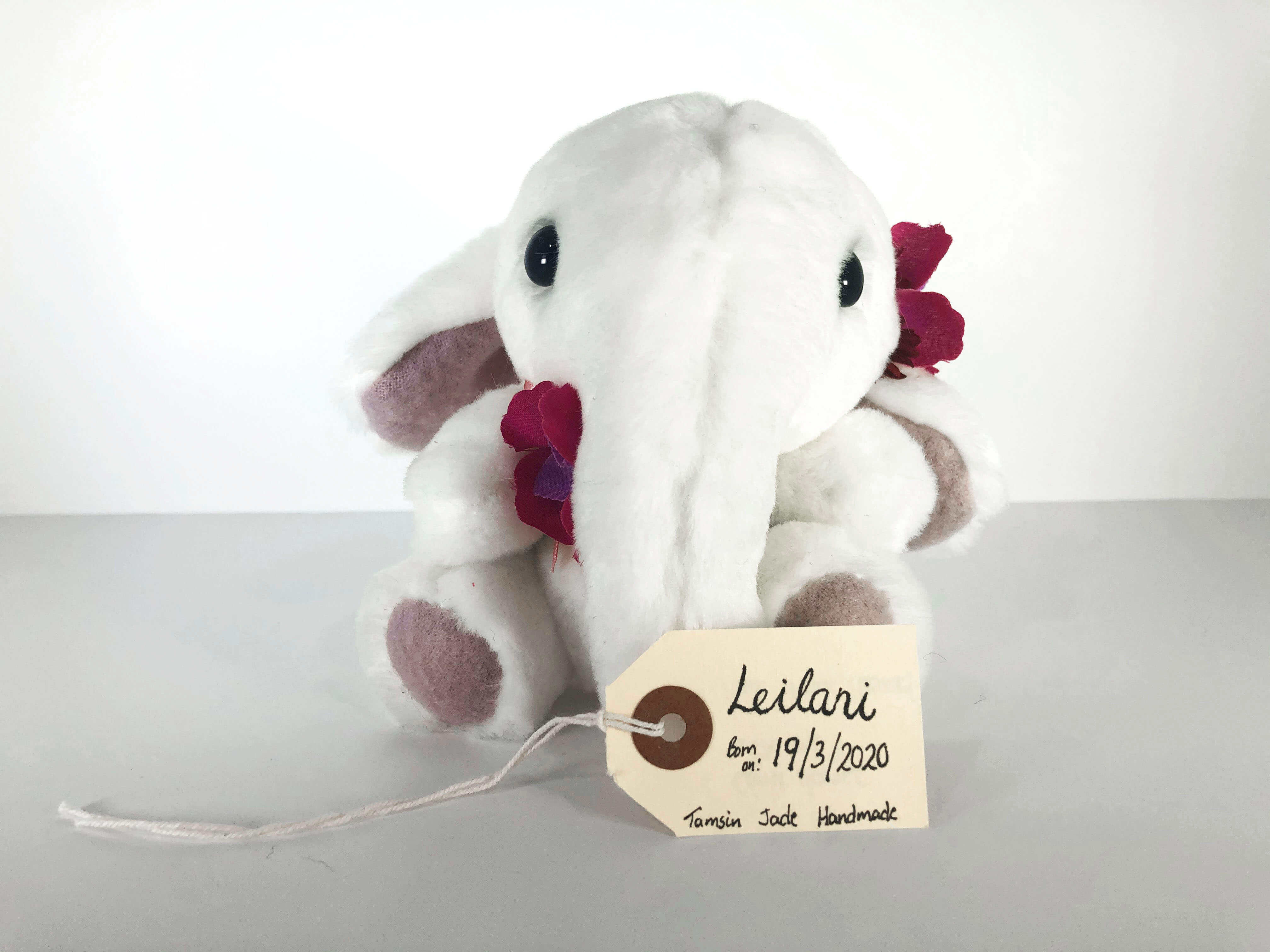 Leilani is an energetic little elephant who can often be found dancing the night away on her favourite beach. Never without flowers in her hair she stands 16.5cm (6 1/2″) tall though she much prefers to sit down where she is then just 13cm (5 1/8″) tall.