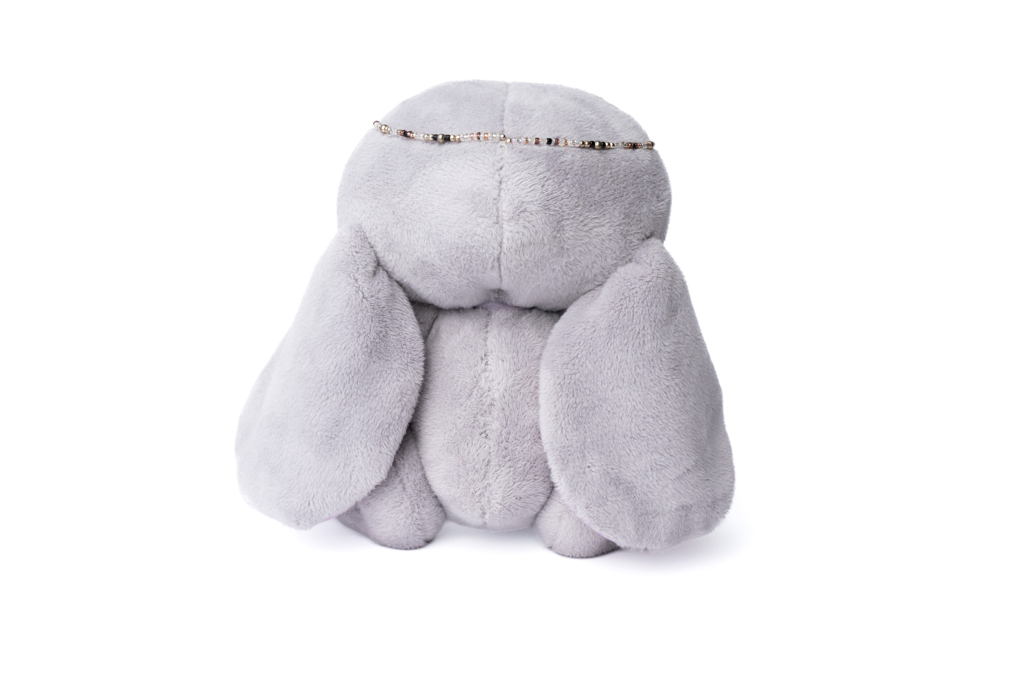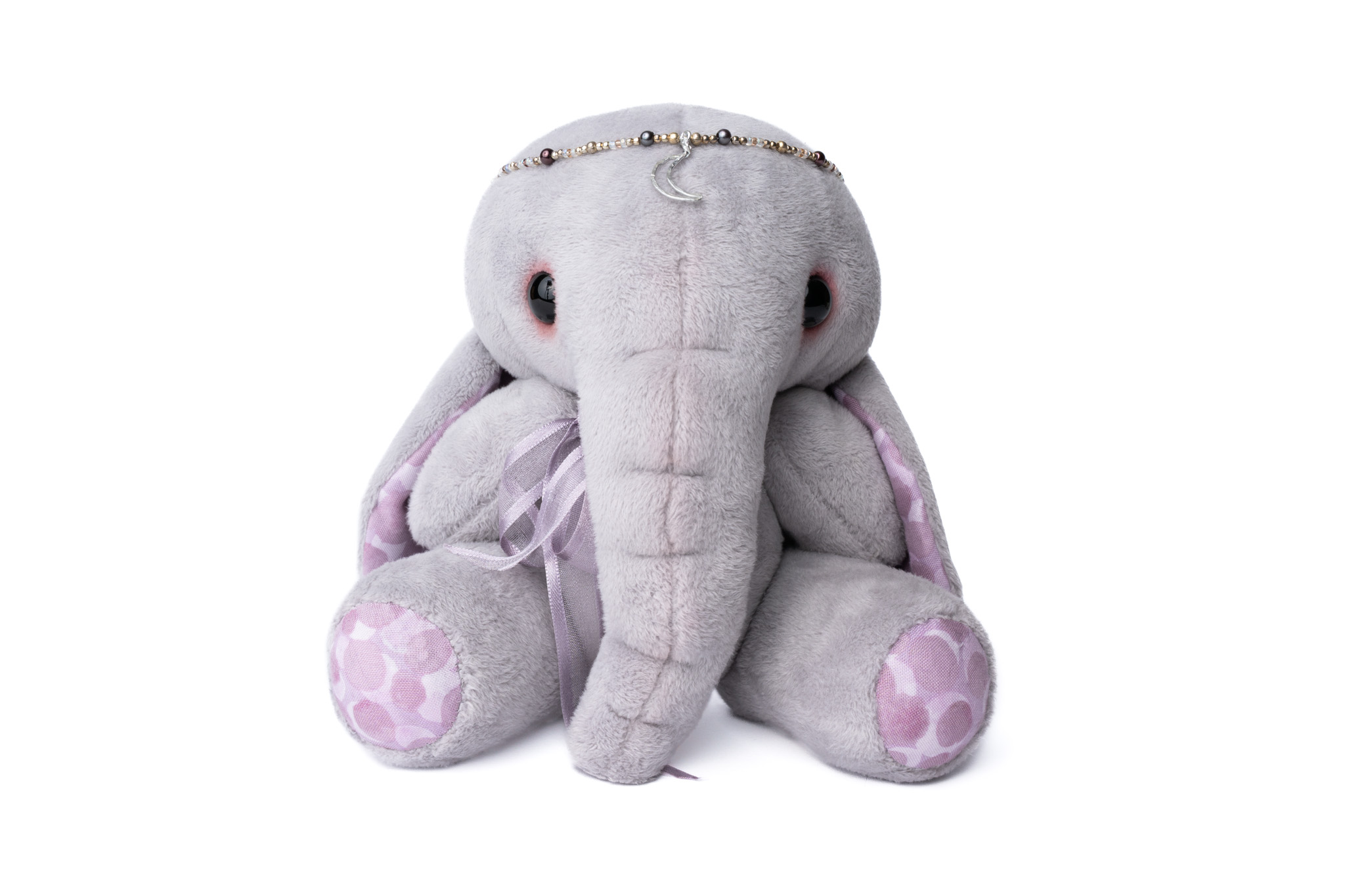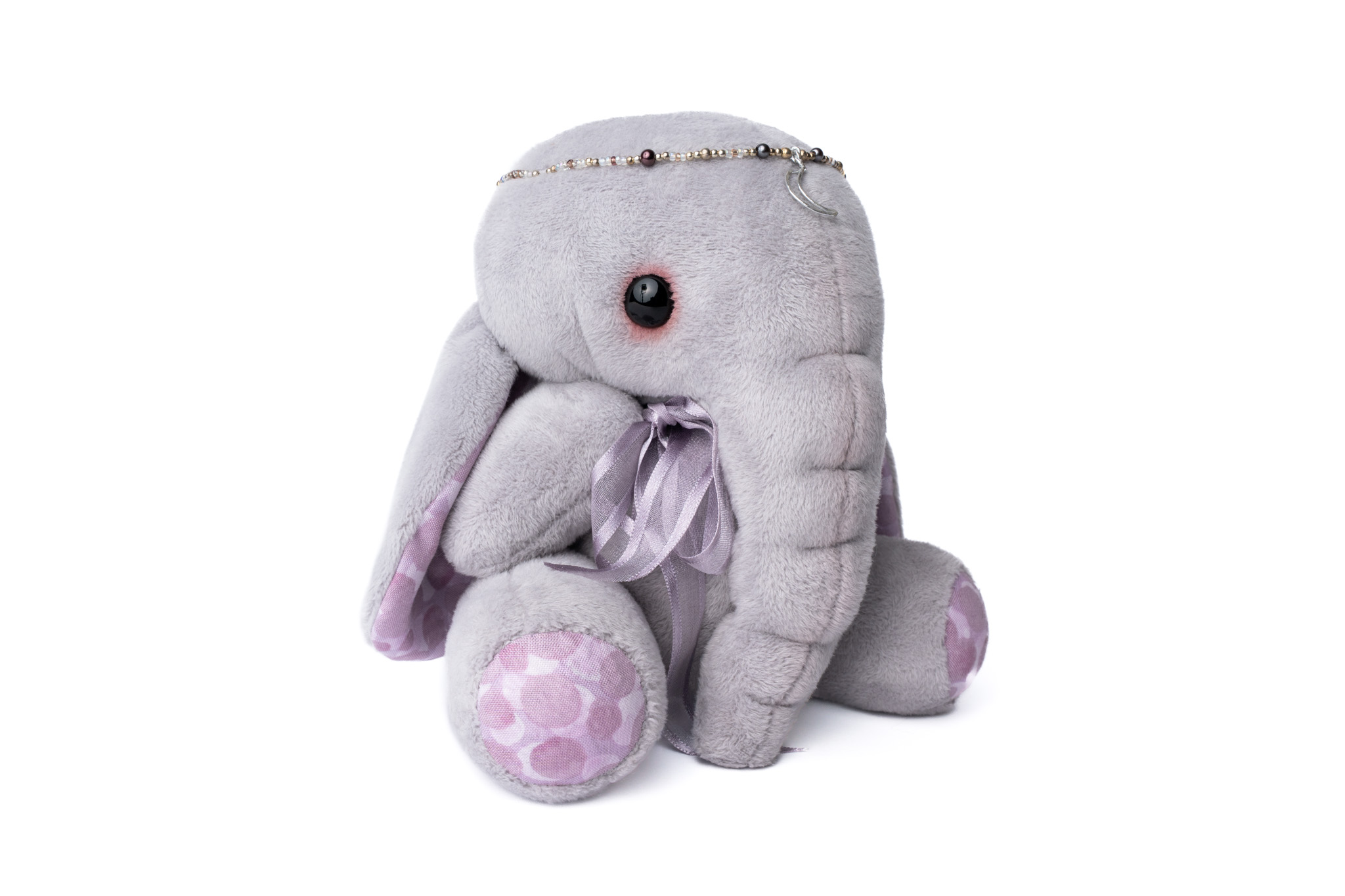 Made from a super soft to the touch short pile faux fur in a soft grey colour that seems to change subtly with the light, Selene has warm grey-pink polycotton inner ears and foot pads. She is firmly stuffed with a combination of clean steel disk weights, highloft polyester and heavy fiberfill stuffings. She has soulful glossy black glass eyes and is five way jointed with a cotter pin for her head and thread jointed arms and legs. Selene also wears a delicate beaded diadem with a handmade hammered metal moon pendent at the centre.