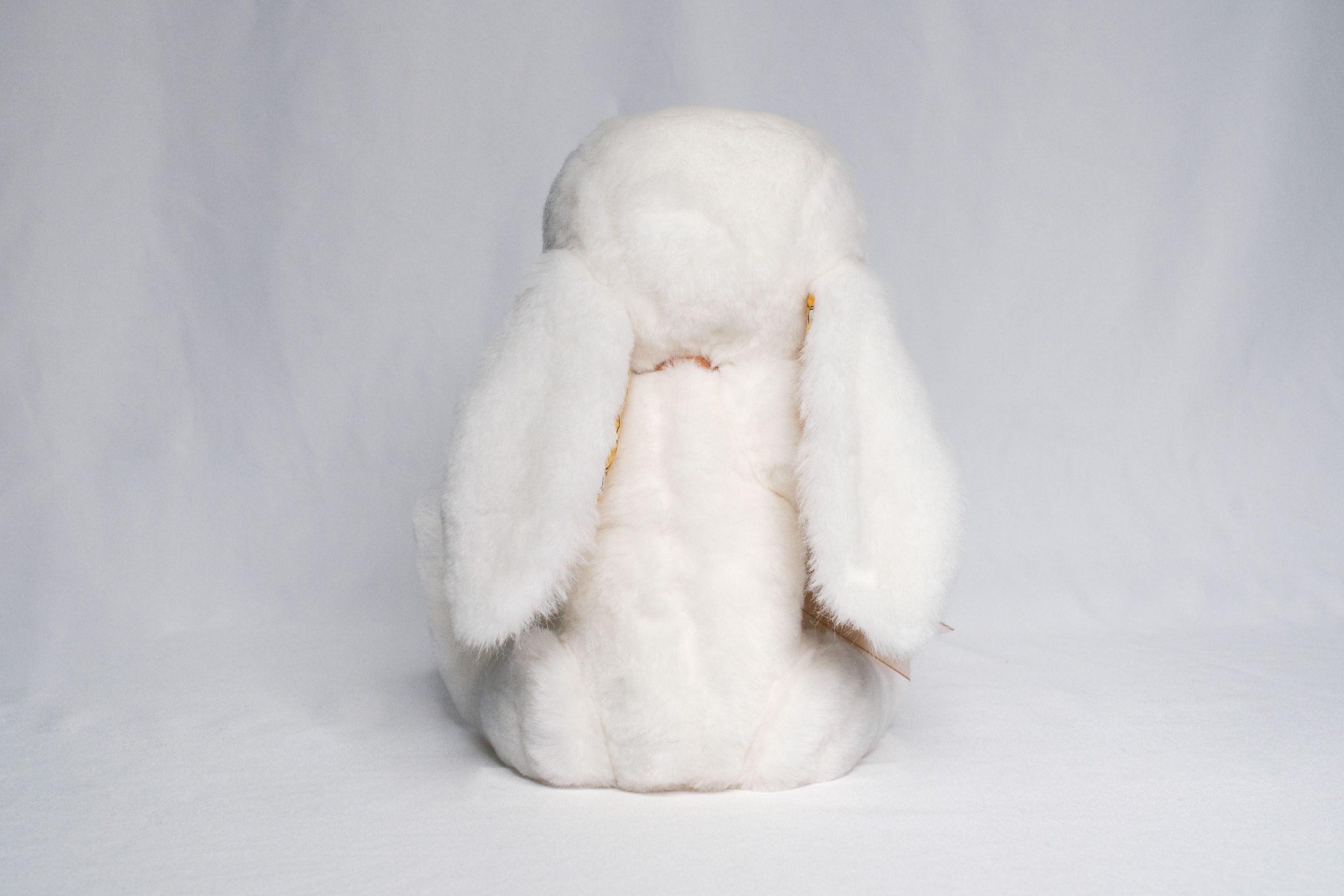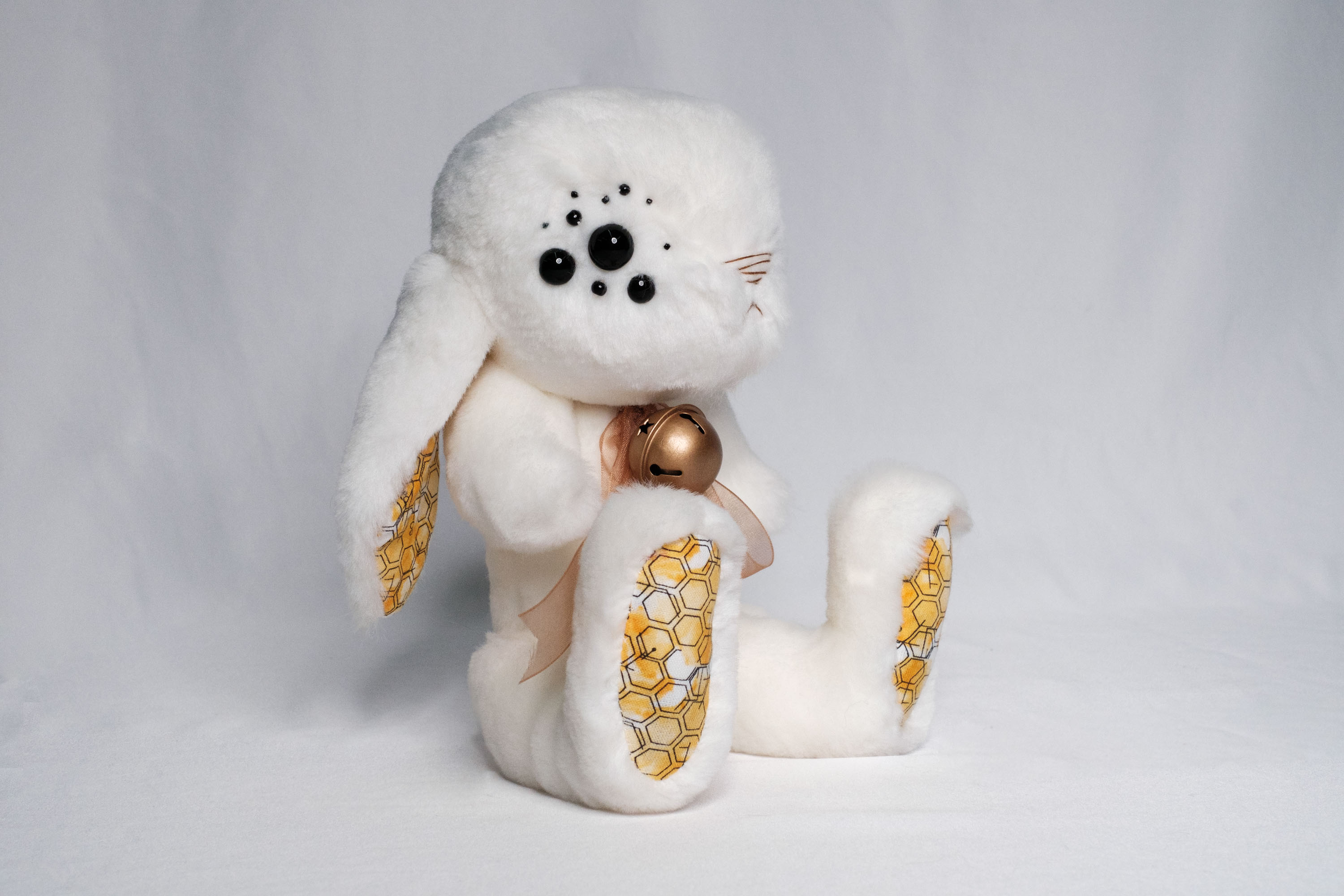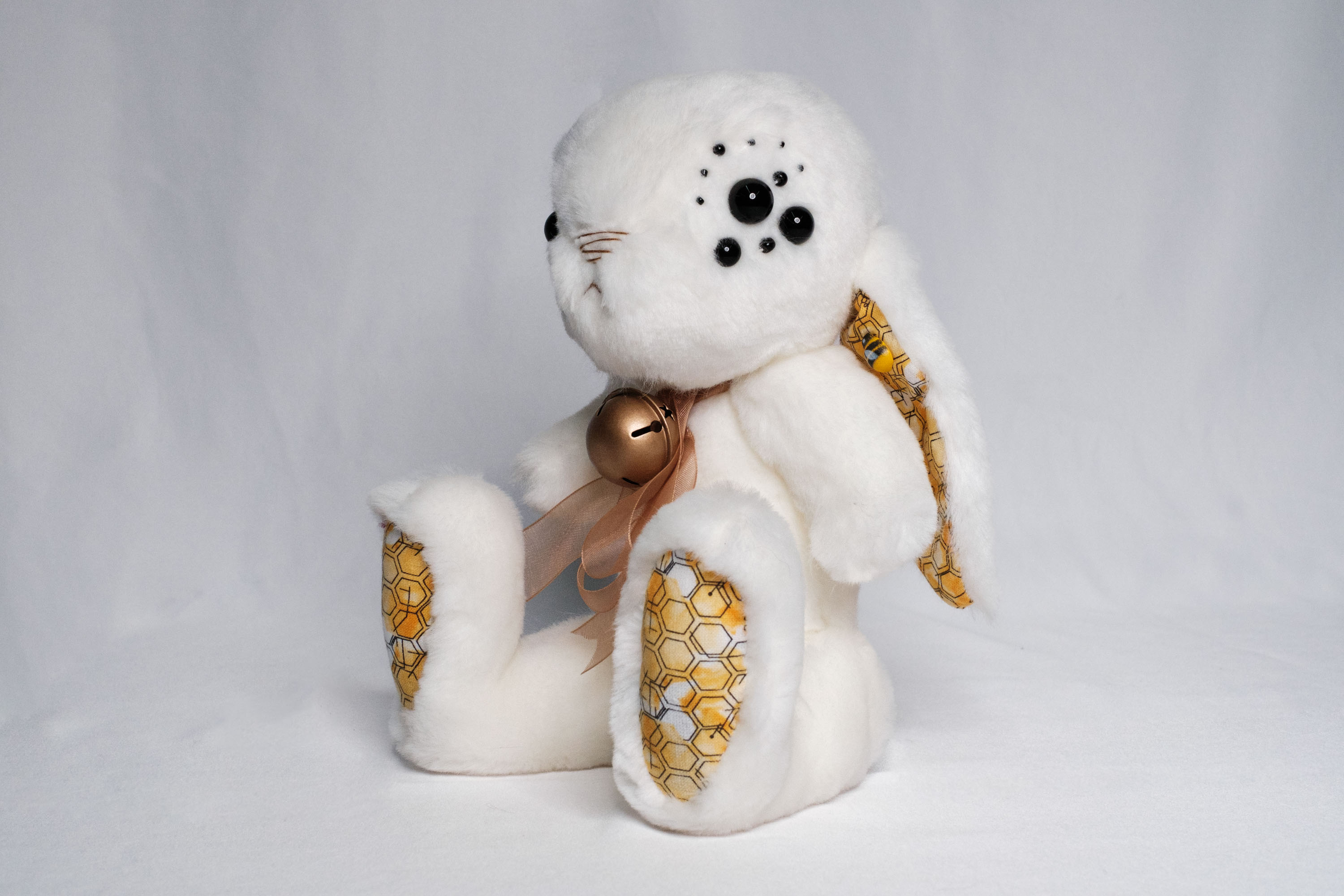 Made from a a lovely dense ivory coloured faux fur with honeycomb patterned cotton foot pads and ears Merope is stuffed with a polyester stuffing and wears a large bronze bell. They’d hate to sneak up on you and give you a fright. Merope has glossy glass eyes, a little wooden bee whispering in their ear and is five way jointed with a cotter pin for the head and thread jointed arms and legs.